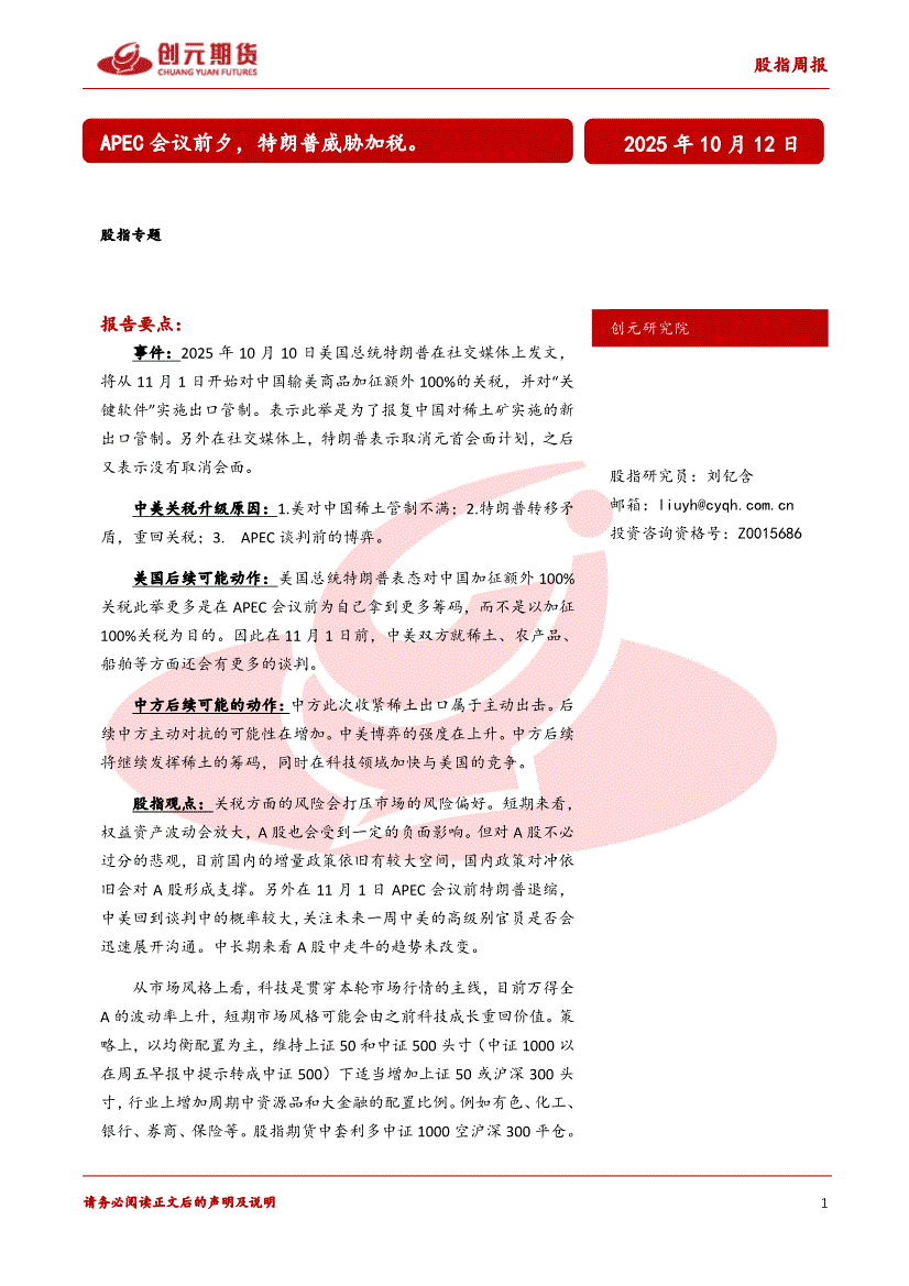 研报:创元期货-股指周报:APEC会议前夕,特朗普威胁加税-251012