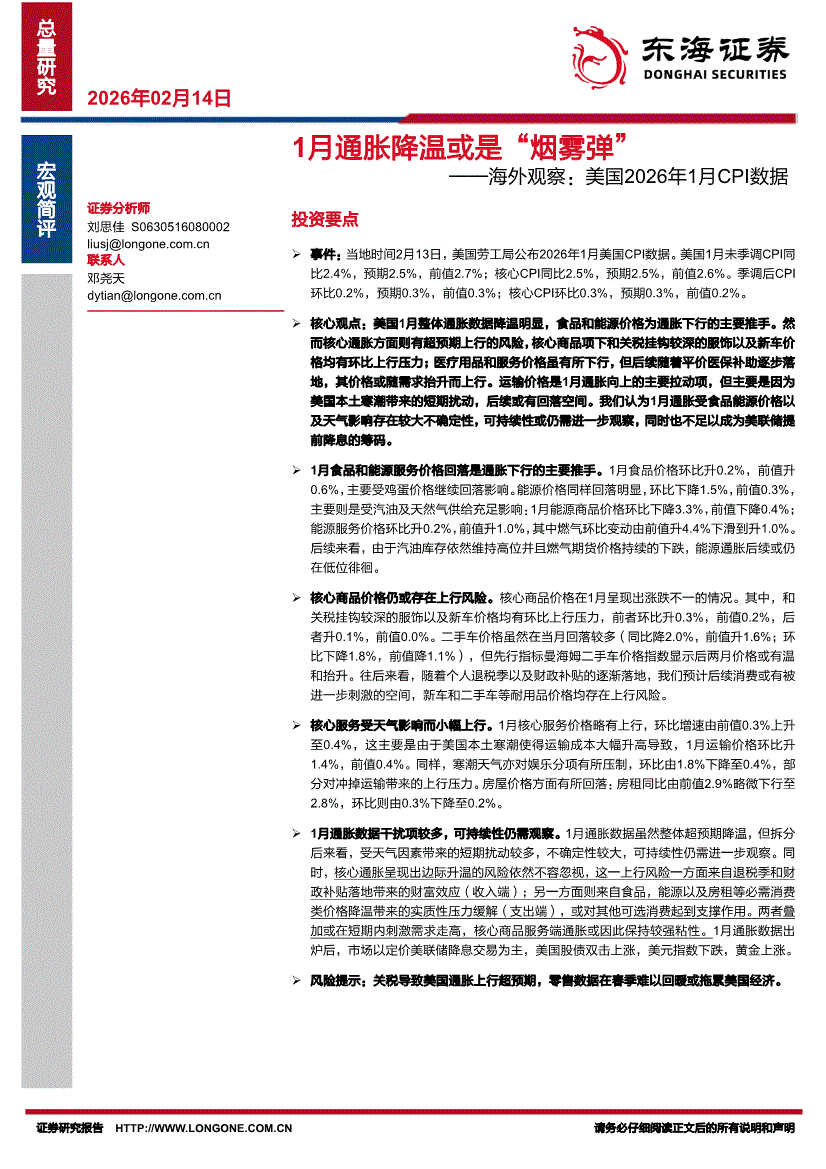 研报:东海证券-海外观察:美国2026年1月CPI数据,1月通胀降温或是“烟雾弹”-260214