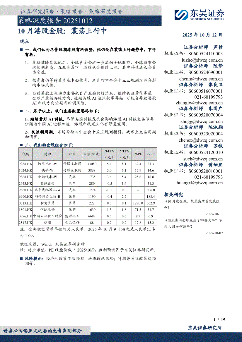 研报:东吴证券-10月港股金股:震荡上行中-251012