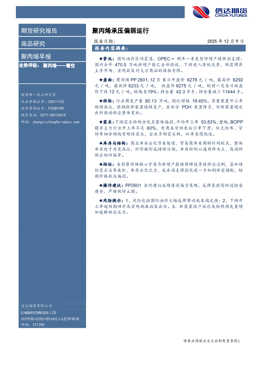 研报:信达期货-聚丙烯早报:聚丙烯承压偏弱运行-251209