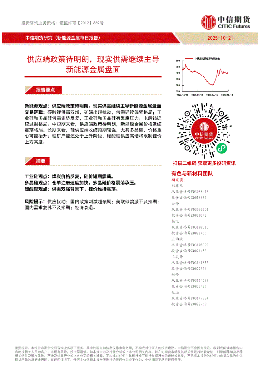 研报:中信期货-新能源金属每日报告:供应端政策待明朗,现实供需继续主导新能源金属盘面-251021