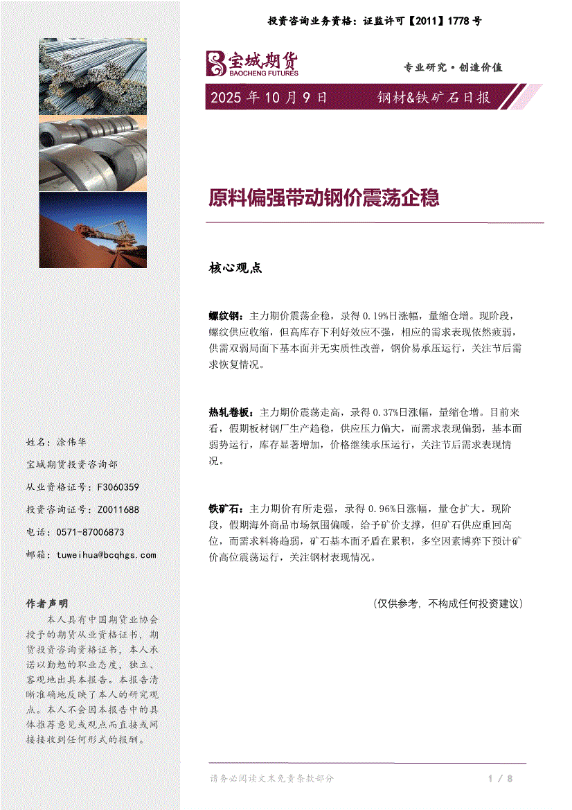 研报:宝城期货-钢材&铁矿石日报:原料偏强带动钢价震荡企稳-251009