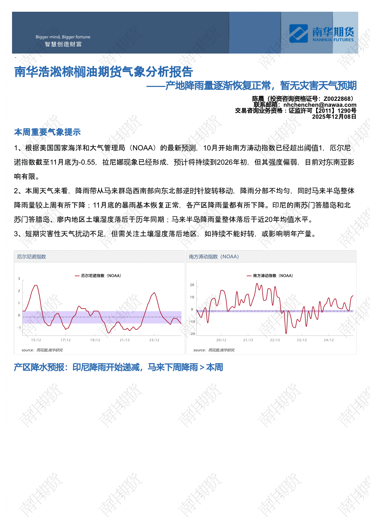 研报:南华期货-浩淞棕榈油期货气象分析报告:产地降雨量逐渐恢复正常,暂无灾害天气预期-251208