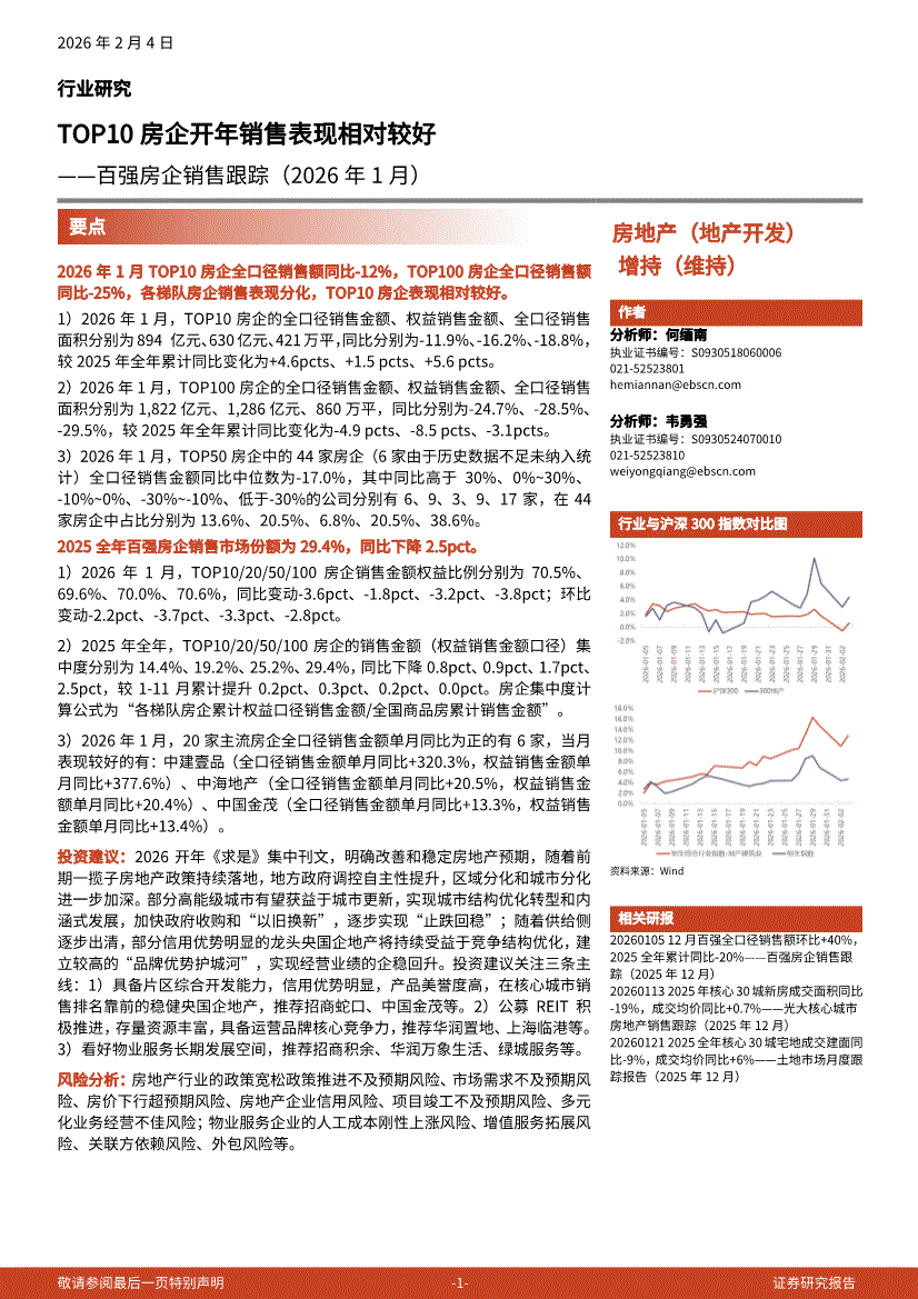 房地产行业研报:光大证券-房地产行业百强房企销售跟踪(2026年1月):TOP10房企开年销售表现相对较好-260204
