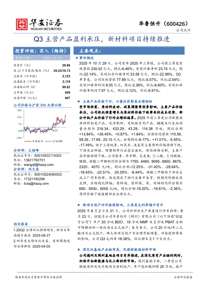 华鲁恒升研报:华安证券-华鲁恒升-600426-Q3主营产品盈利承压,新材料项目持续推进-251113