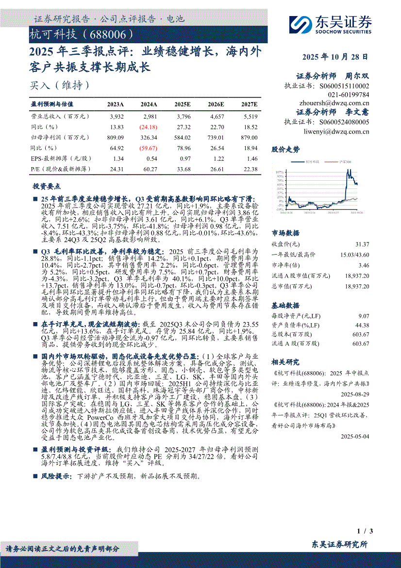 杭可科技研报:东吴证券-杭可科技-688006-2025年三季报点评:业绩稳健增长,海内外客户共振支撑长期成长-251028