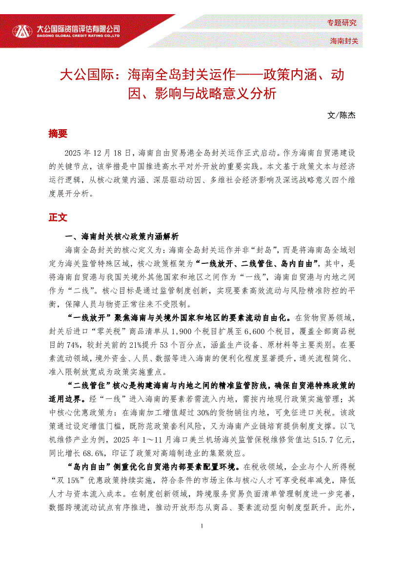 研报:大公国际-海南全岛封关运作——政策内涵、动因、影响与战略意义分析-251229