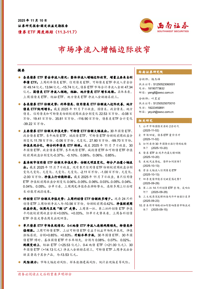 研报:西南证券-债券ETF周度跟踪:市场净流入增量边际收窄-251110