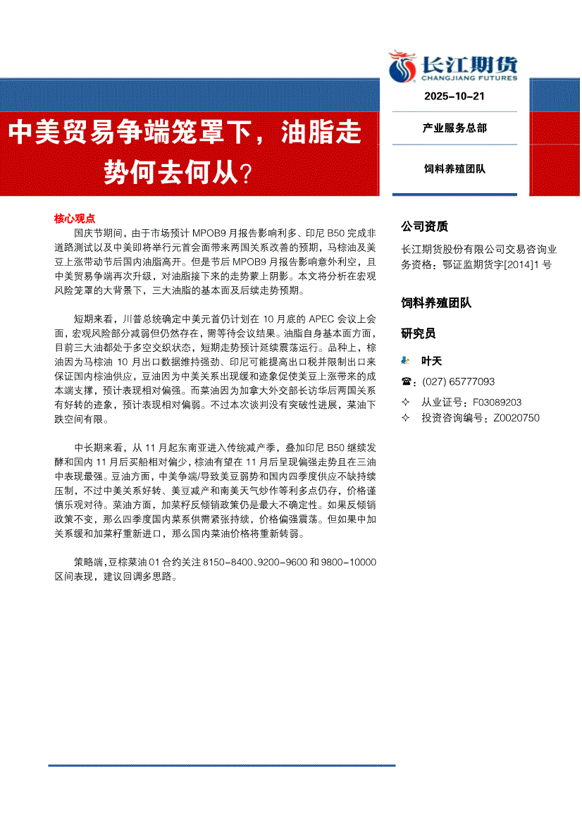 研报:长江期货-中美贸易争端笼罩下,油脂走势何去何从?-251021