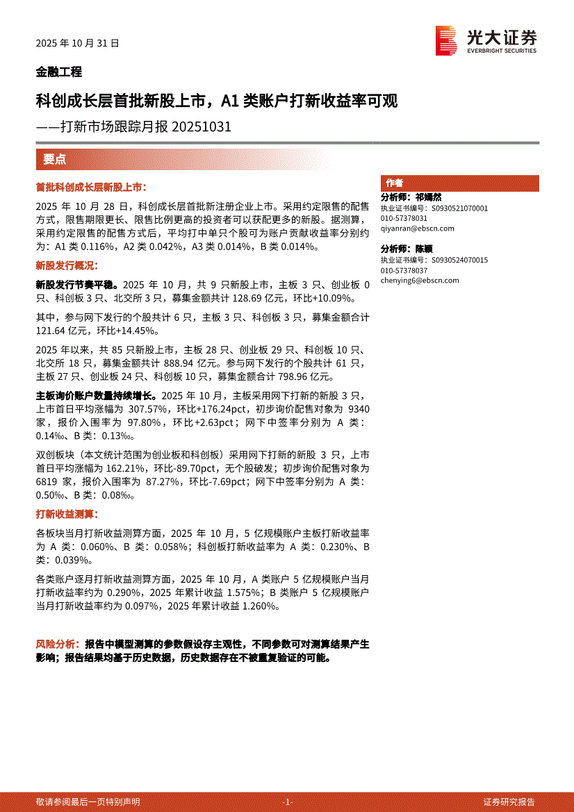 研报:光大证券-打新市场跟踪月报:科创成长层首批新股上市,A1类账户打新收益率可观-251031