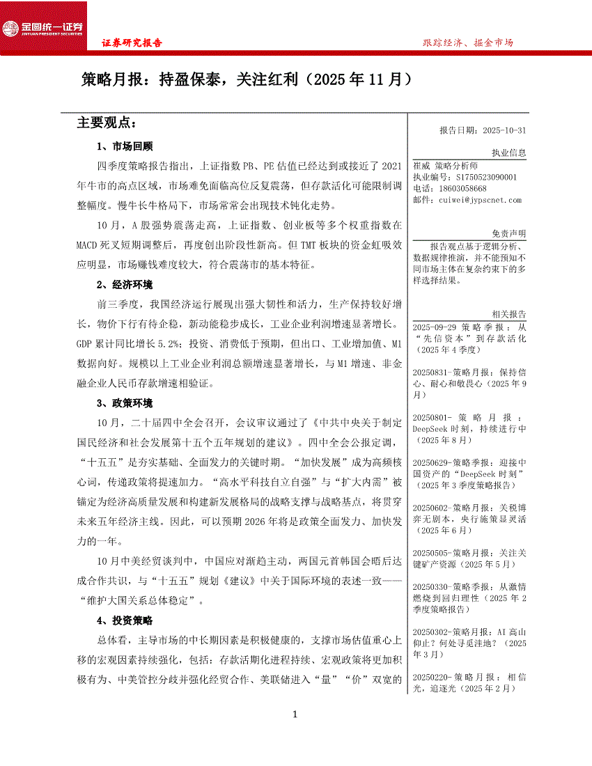 研报:金圆统一证券-策略月报:持盈保泰,关注红利(2025年11月)-251031