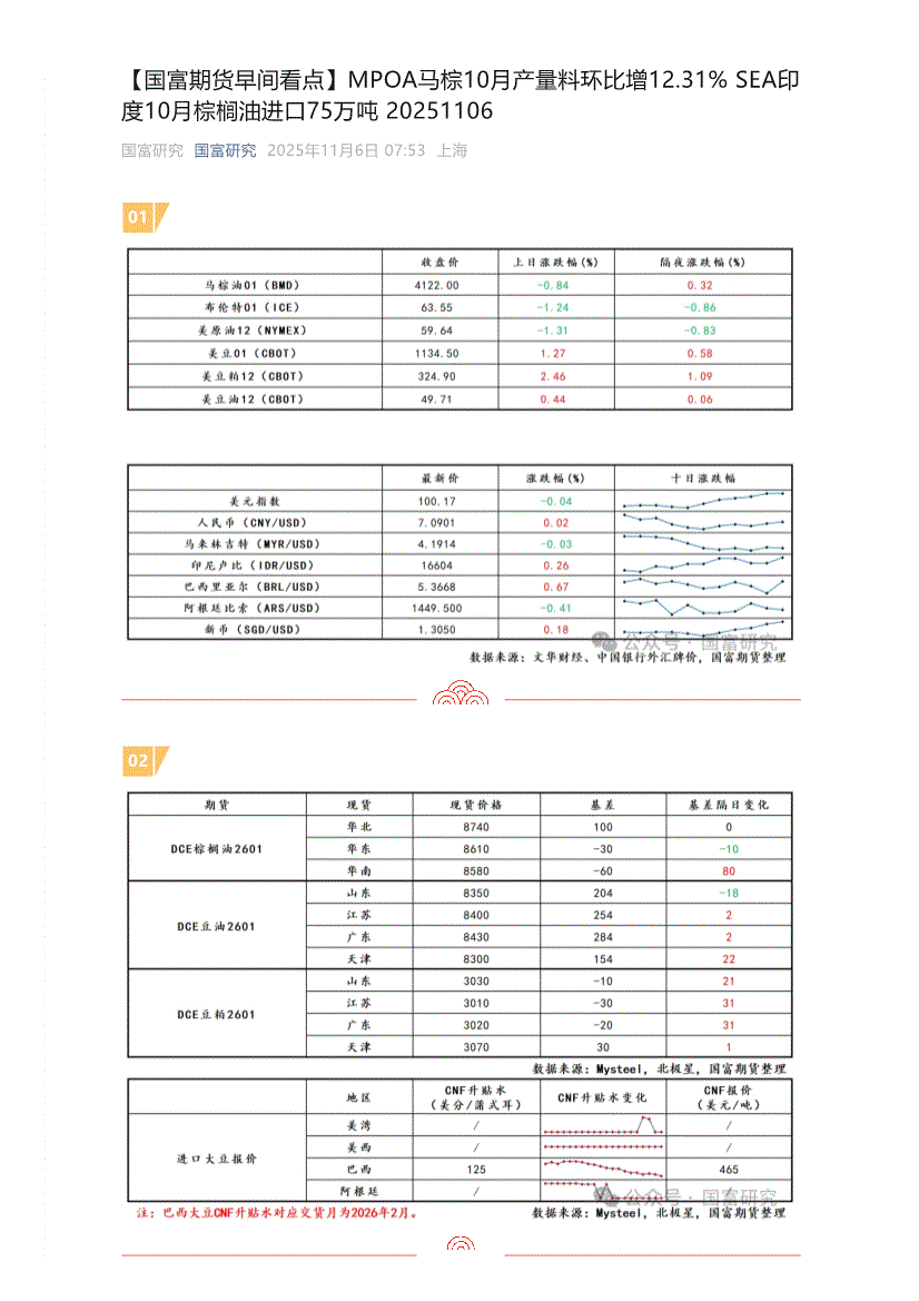 研报:国富期货-【早间看点】MPOA马棕10月产量料环比增12.31%,SEA印度10月棕榈油进口75万吨-251106