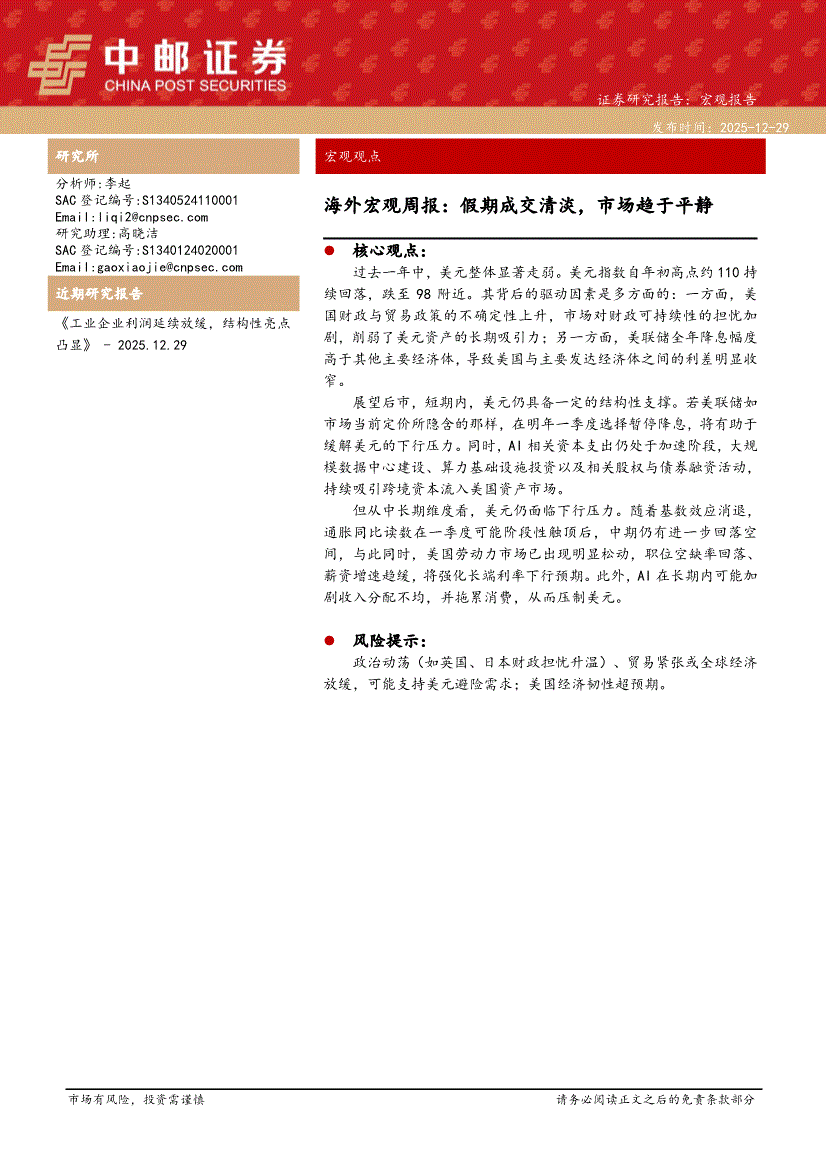 研报:中邮证券-海外宏观周报:假期成交清淡,市场趋于平静-251229