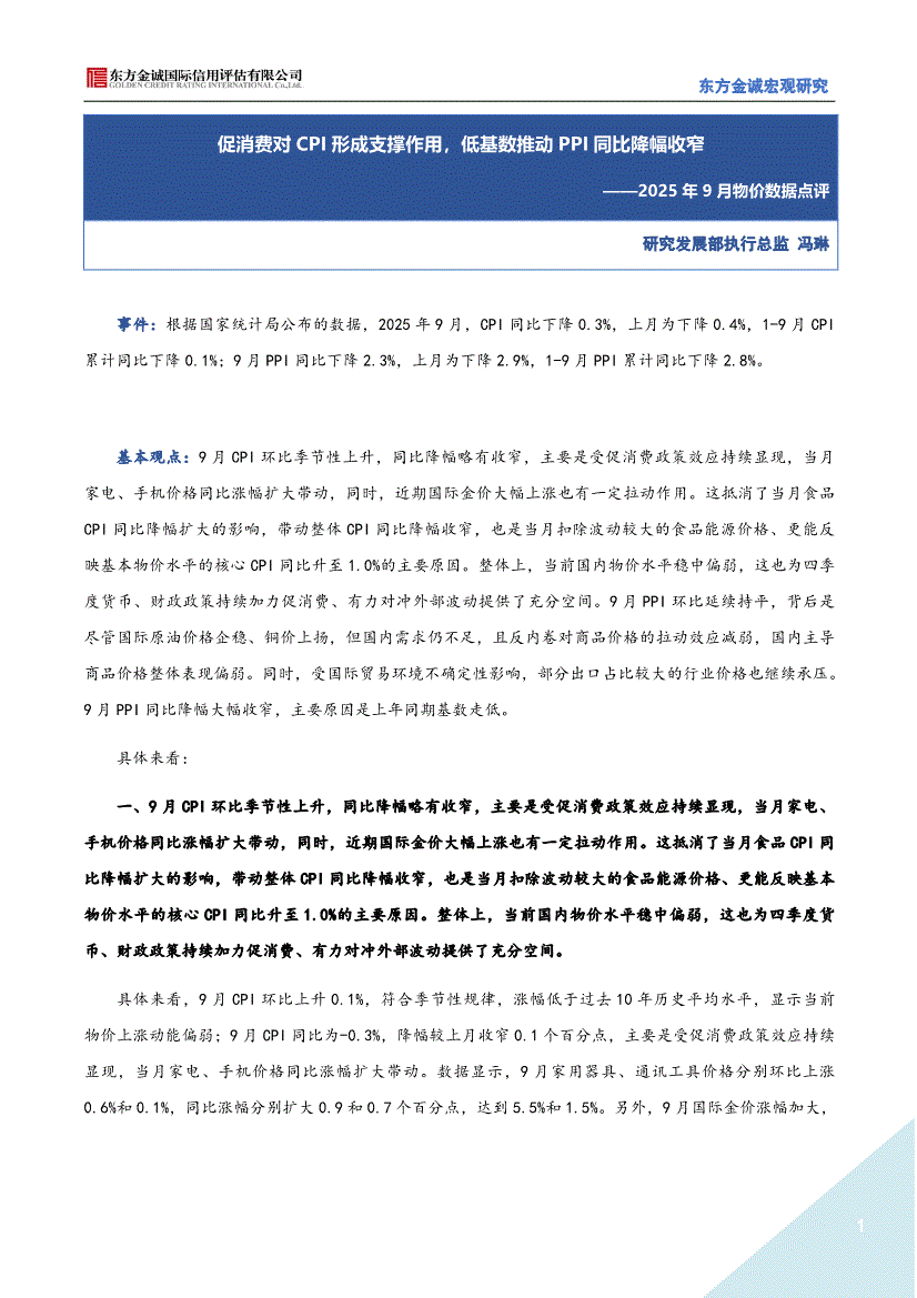 研报:东方金诚-2025年9月物价数据点评:促消费对CPI形成支撑作用,低基数推动PPI同比降幅收窄-251015