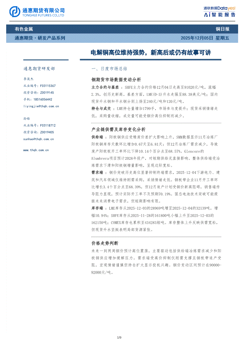 研报:通惠期货-铜日报:电解铜高位维持强势,新高后或仍有故事可讲-251205