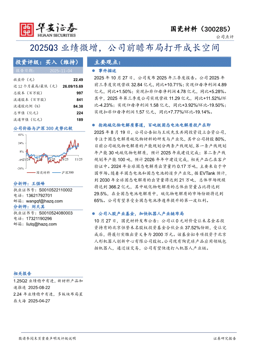 国瓷材料研报:华安证券-国瓷材料-300285-2025Q3业绩微增,公司前瞻布局打开成长空间-251104
