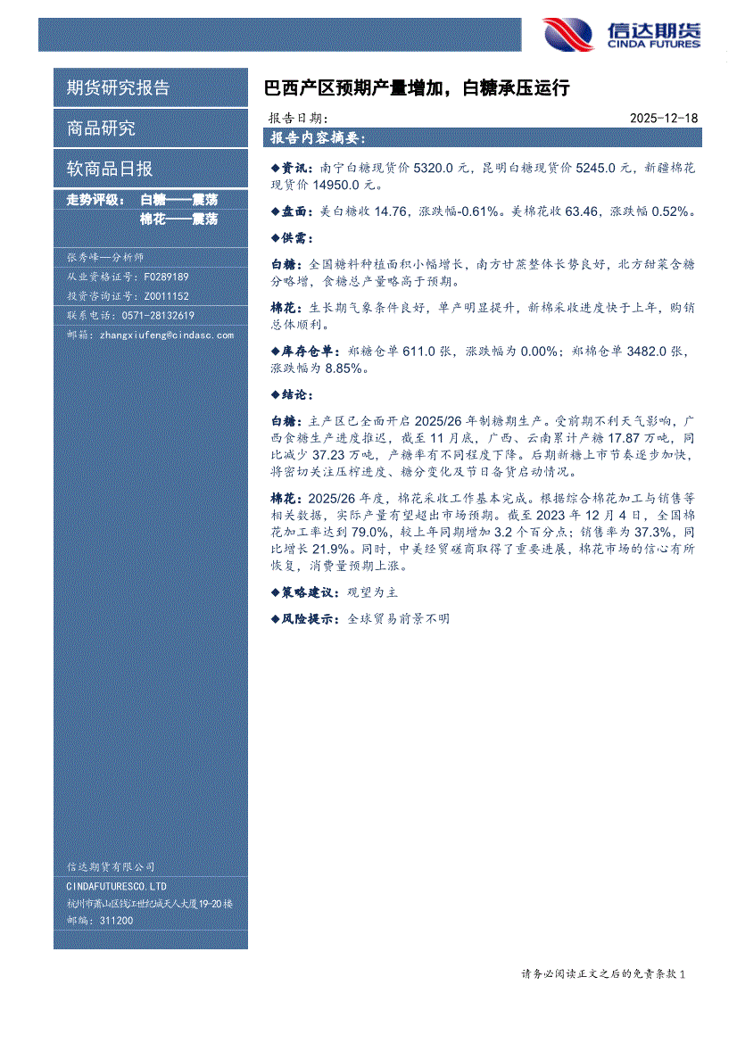 研报:信达期货-软商品日报:巴西产区预期产量增加,白糖承压运行-251218