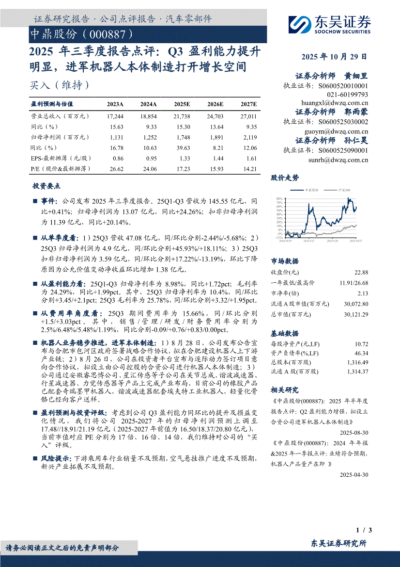中鼎股份研报:东吴证券-中鼎股份-000887-2025年三季度报告点评:Q3盈利能力提升明显,进军机器人本体制造打开增长空间-251029
