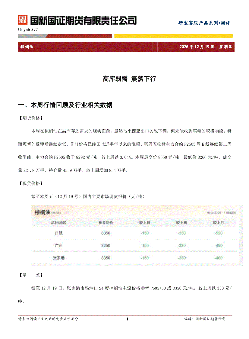 研报:国新国证期货-棕榈油周评:高库弱需,震荡下行-251219