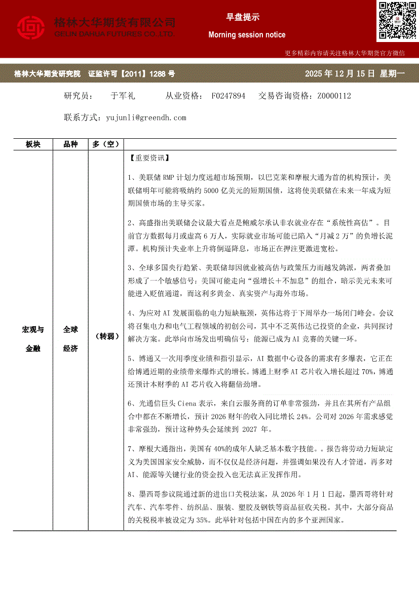 研报:格林大华期货-宏观与金融早盘提示-251215