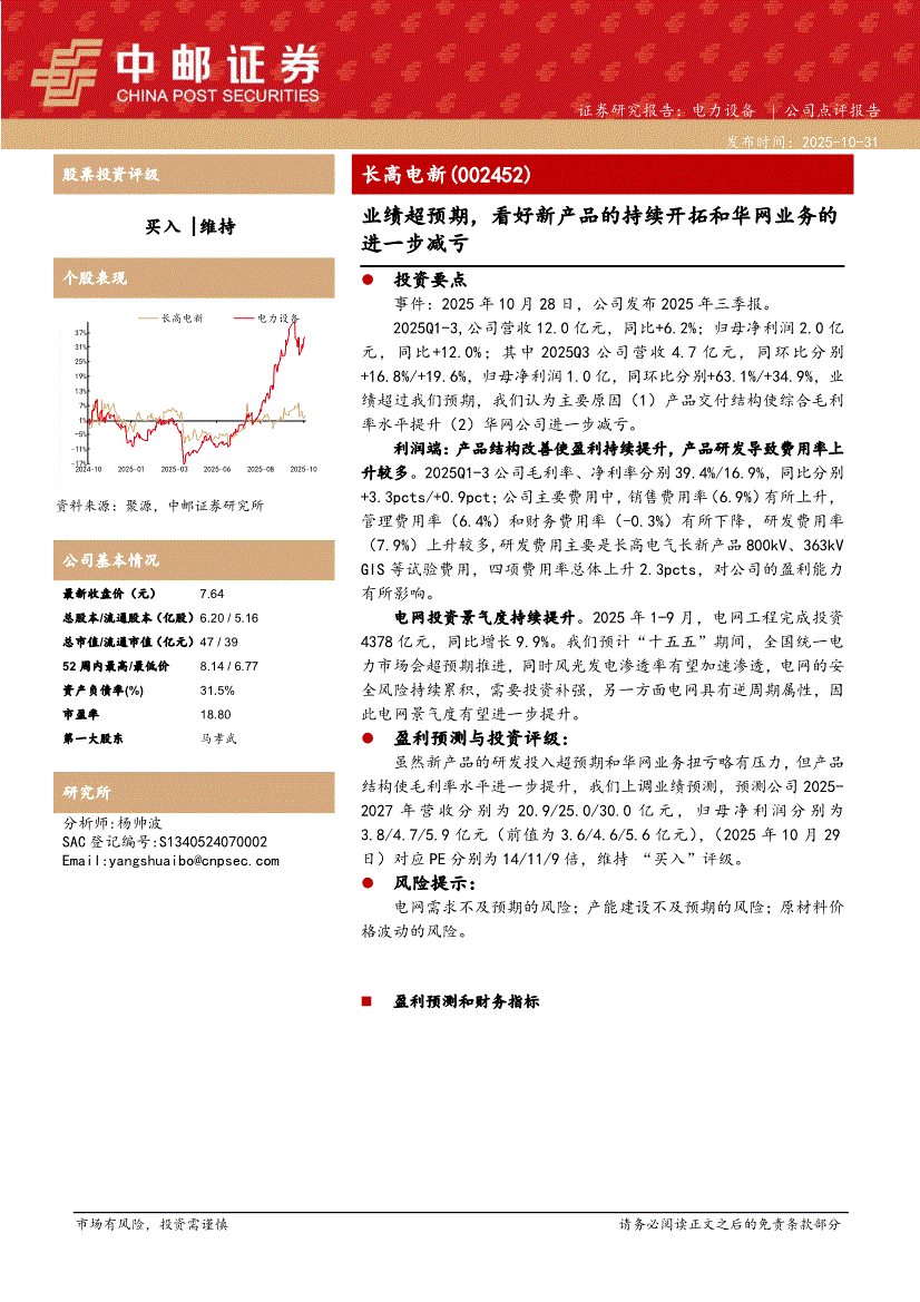 长高电新研报:中邮证券-长高电新-002452-业绩超预期,看好新产品的持续开拓和华网业务的进一步减亏-251031