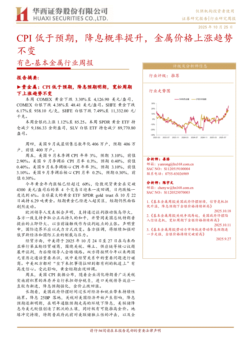 有色~基本金属行业研报:华西证券-有色~基本金属行业周报:CPI低于预期,降息概率提升,金属价格上涨趋势不变-251025