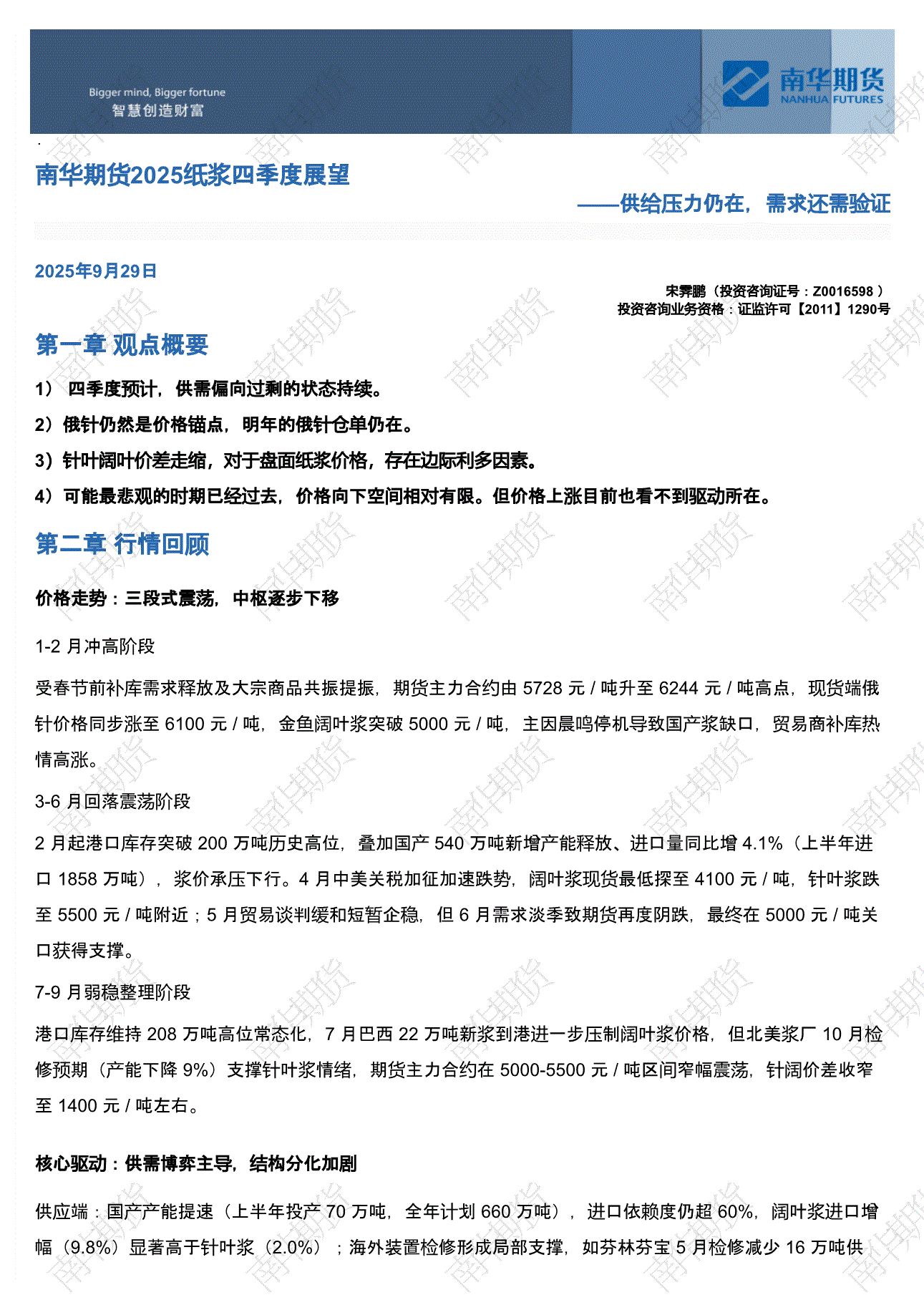 研报:南华期货-2025纸浆四季度展望:供给压力仍在,需求还需验证-250929