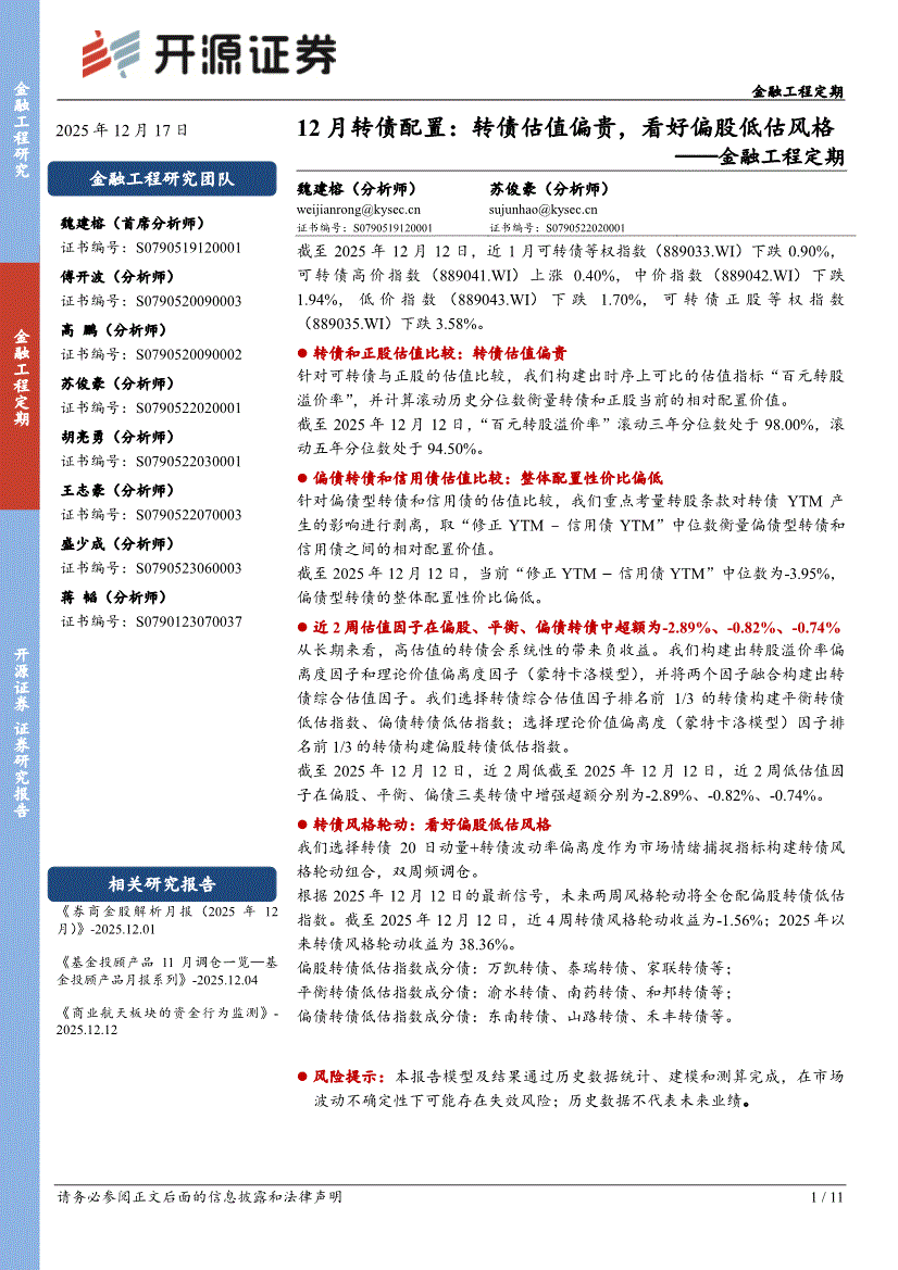 研报:开源证券-金融工程定期:12月转债配置,转债估值偏贵,看好偏股低估风格-251217
