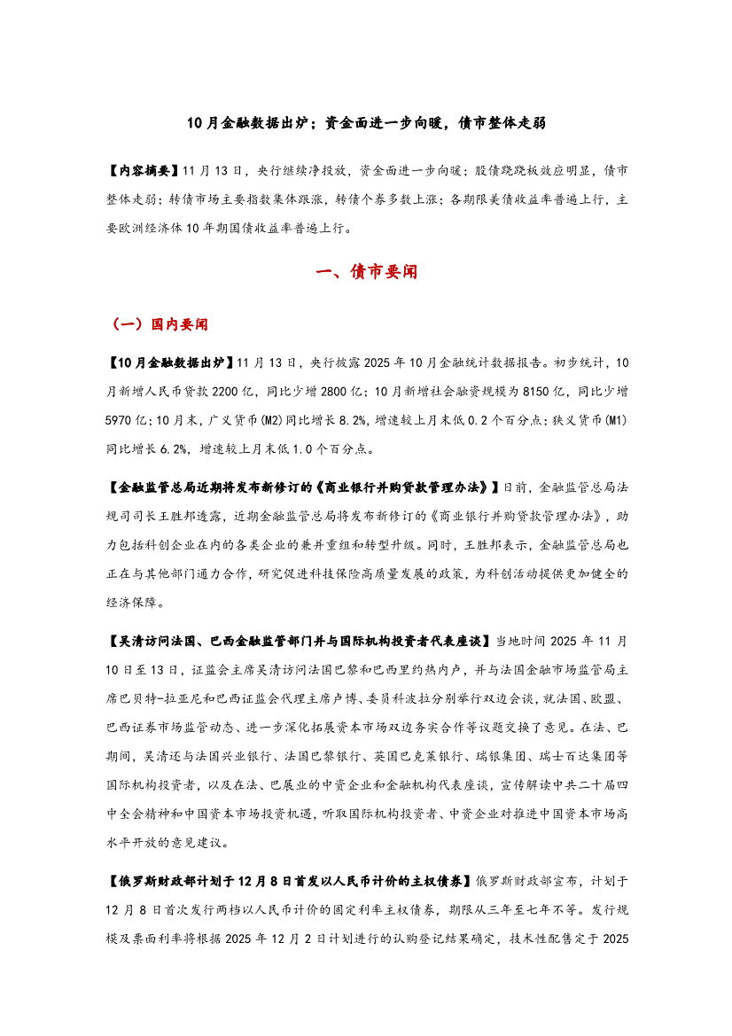 研报:东方金诚-10月金融数据出炉;资金面进一步向暖,债市整体走弱-251113