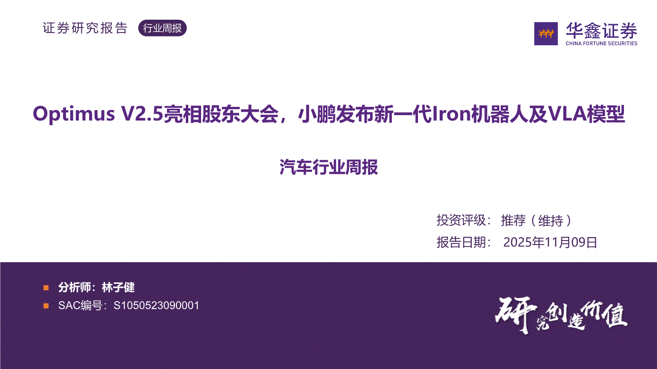 汽车行业研报:华鑫证券-汽车行业周报:Optimus V2.5亮相股东大会,小鹏发布新一代Iron机器人及VLA模型-251109