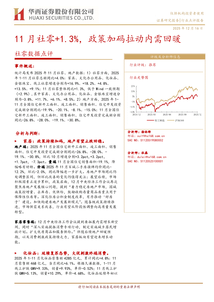 社零行业研报:华西证券-社零行业数据点评:11月社零+1.3%,政策加码拉动内需回暖-251216