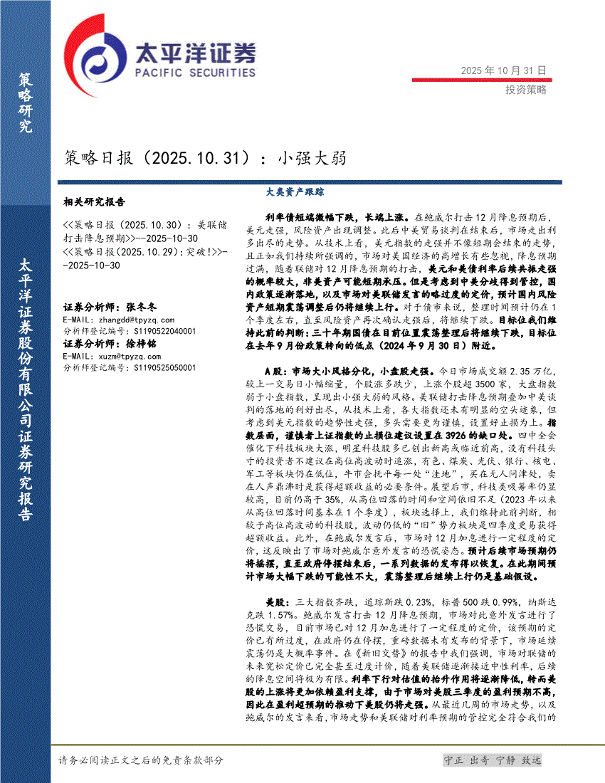 研报:太平洋证券-策略日报(2025.10.31):小强大弱-251031