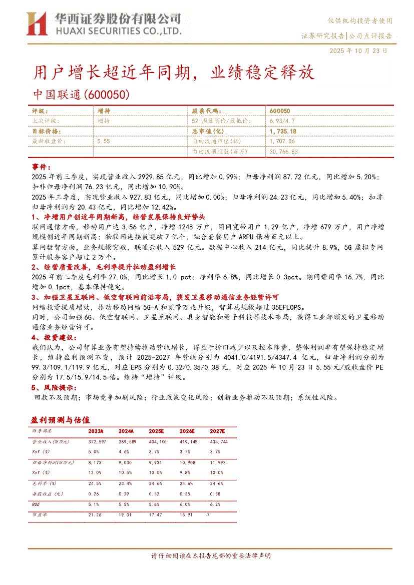 中国联通研报:华西证券-中国联通-600050-用户增长超近年同期,业绩稳定释放-251023