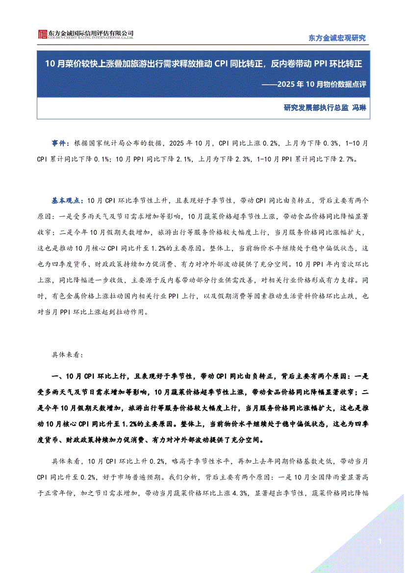 东方金诚-2025年10月物价数据点评:10月菜价较快上涨叠加旅游出行需求释放推动CPI同比转正,反内卷带动PPI环比转正-251110