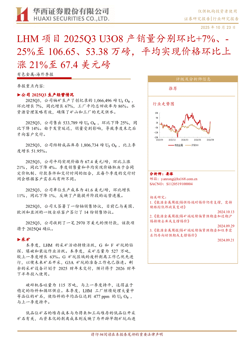 有色金属行业研报:华西证券-有色金属行业~海外季报:LHM项目2025Q3 U3O8产销量分别环比+7%、下降25%至106.65、53.38万磅,平均实现价格环比上涨21%至67.4美元磅-251023