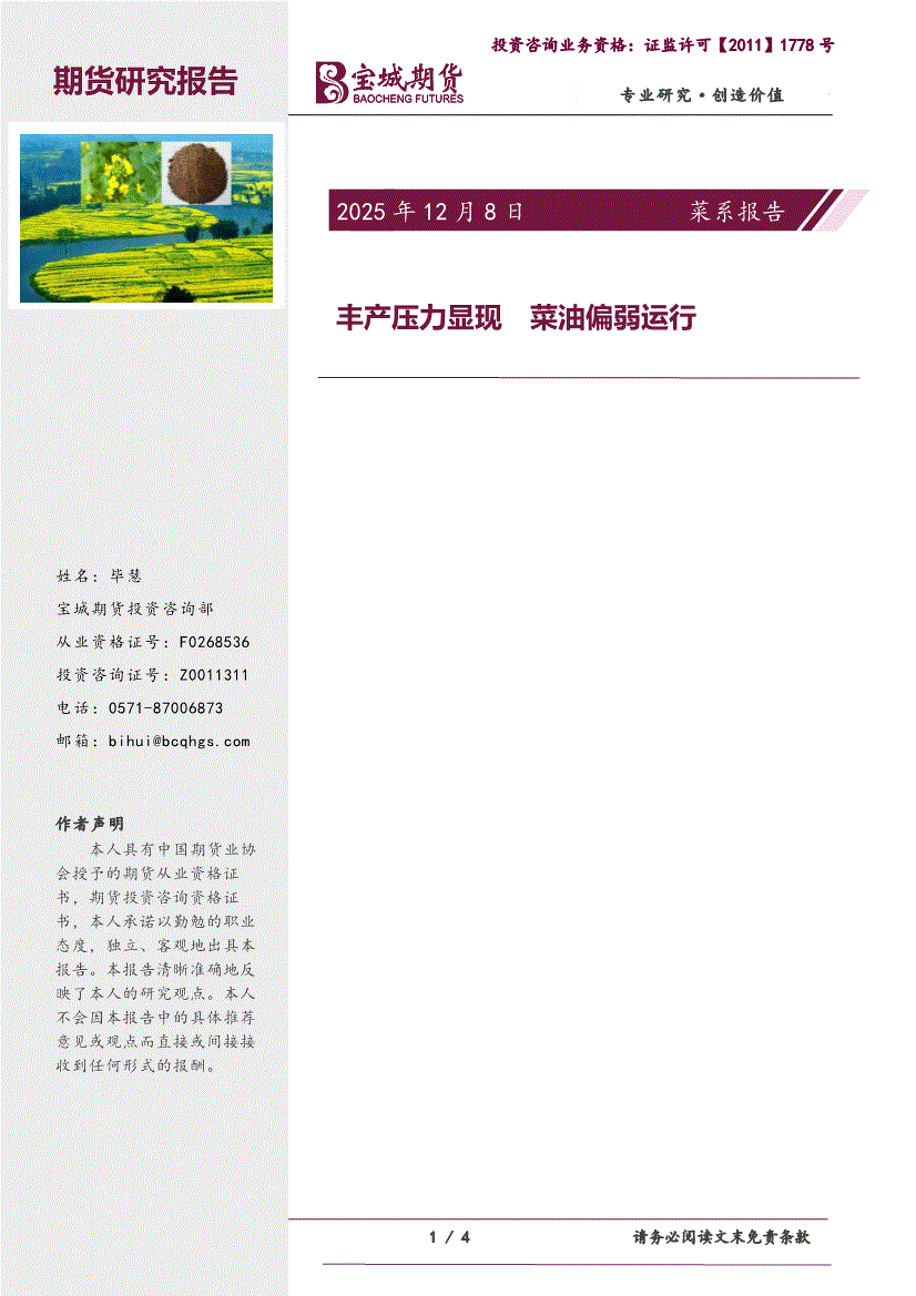 研报:宝城期货-菜系报告:丰产压力显现,菜油偏弱运行-251208