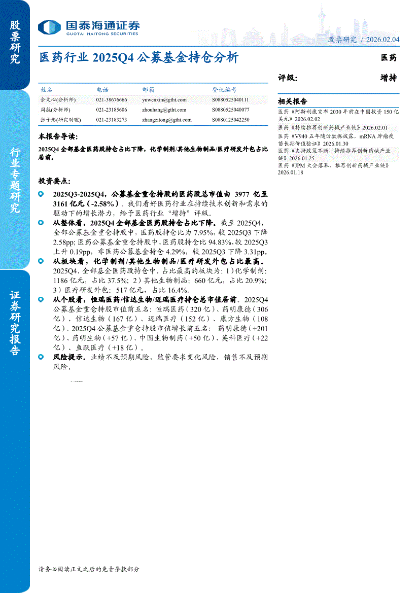 医药行业研报:国泰海通证券-医药行业2025Q4公募基金持仓分析-260204