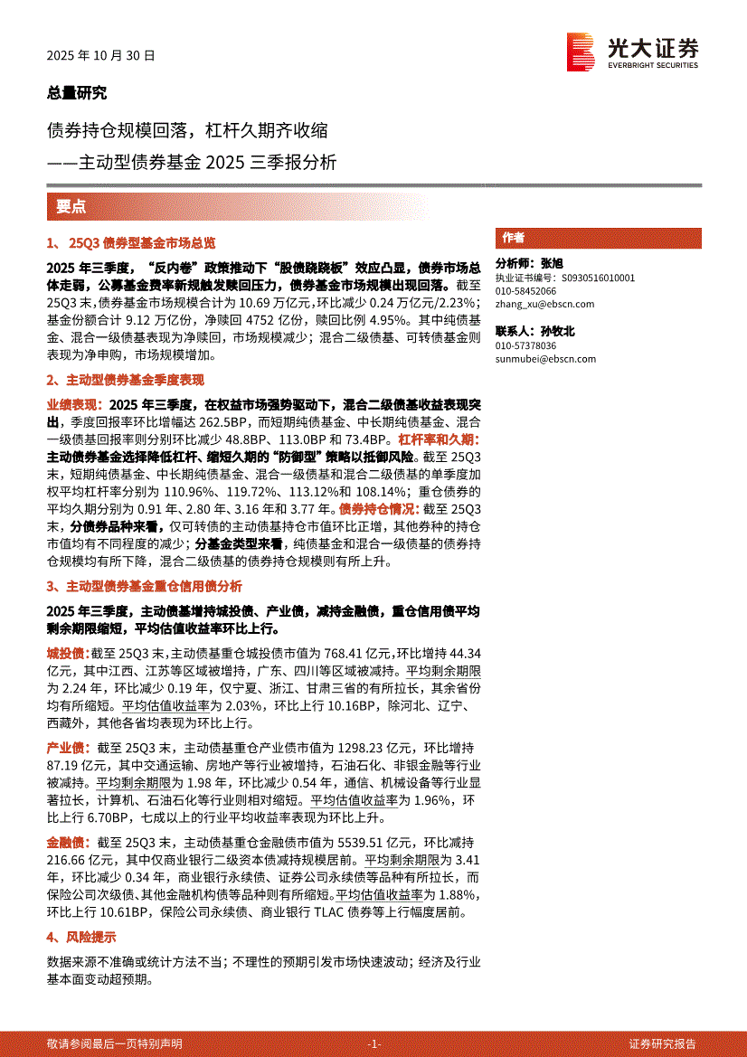 研报:光大证券-主动型债券基金2025三季报分析:债券持仓规模回落,杠杆久期齐收缩-251030