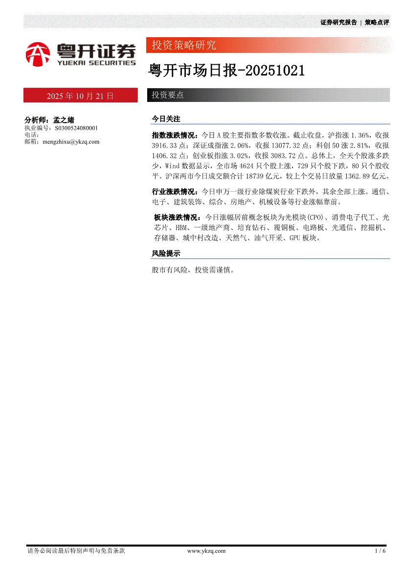 研报:粤开证券-粤开市场日报-251021