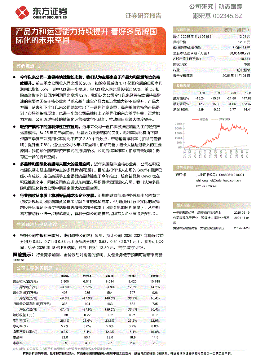 潮宏基研报:东方证券-潮宏基-002345-产品力和运营能力持续提升,看好多品牌国际化的未来空间-251105