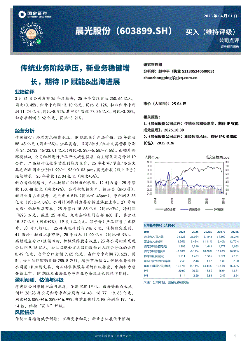晨光股份研报:国金证券-晨光股份-603899-传统业务阶段承压,新业务稳健增长,期待IP赋能&出海进展-260401