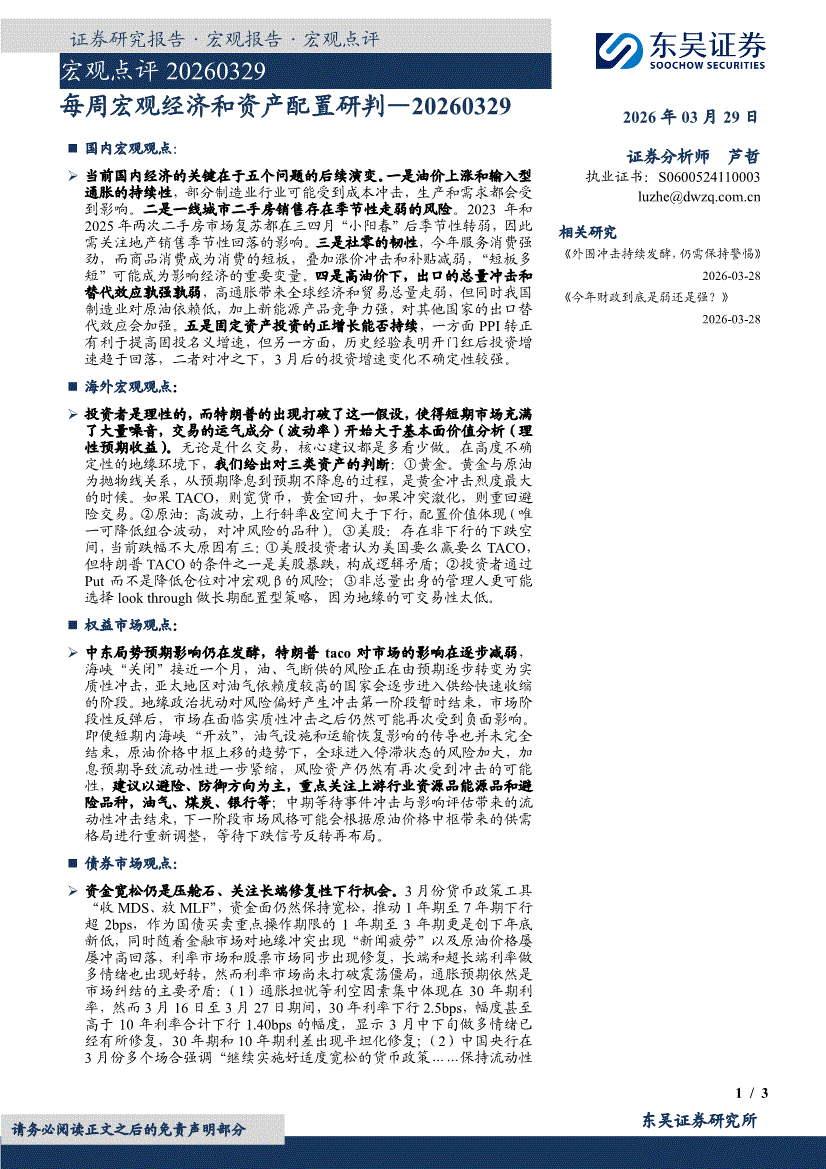 研报:东吴证券-每周宏观经济和资产配置研判-260329