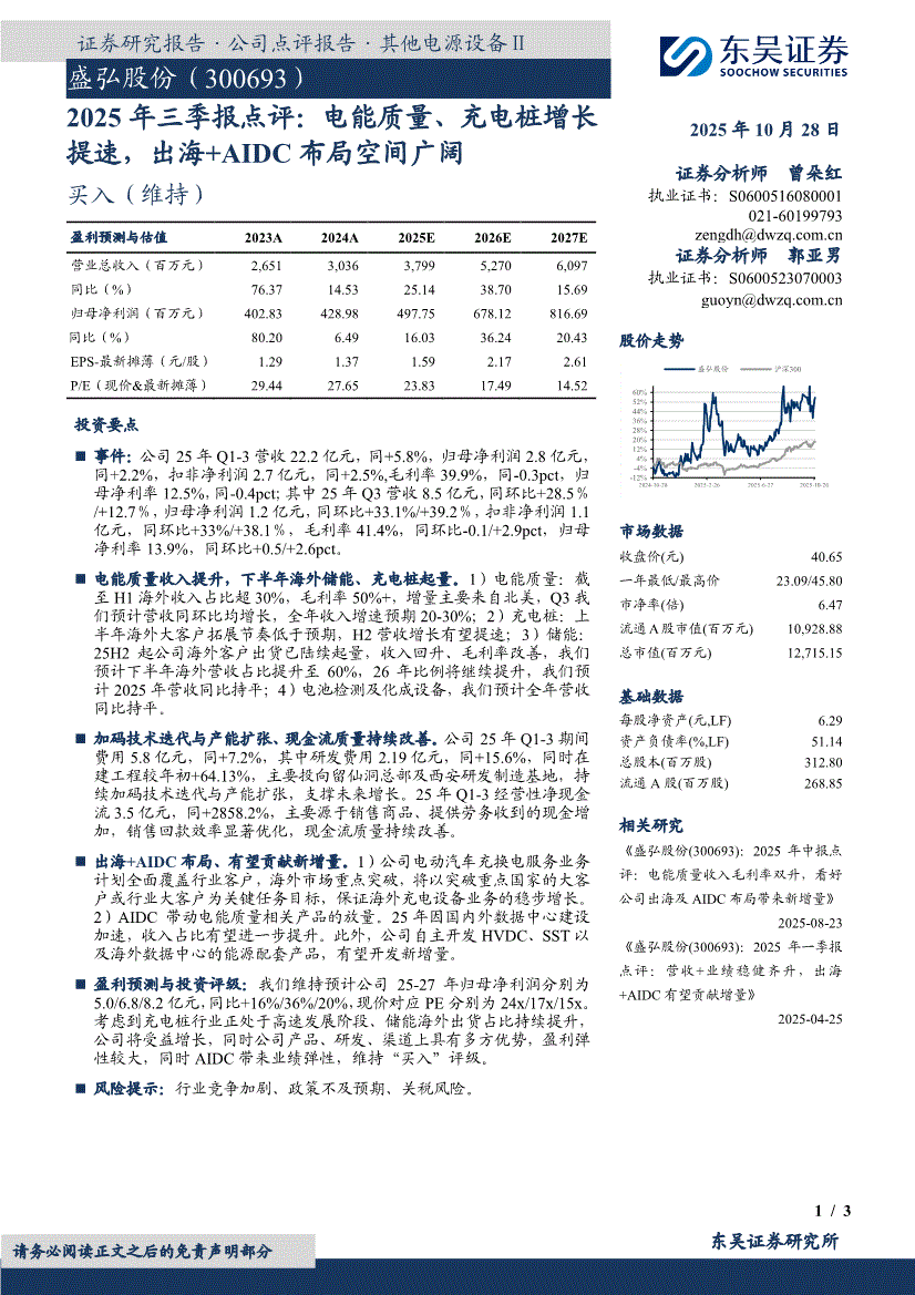 盛弘股份研报:东吴证券-盛弘股份-300693-2025年三季报点评:电能质量、充电桩增长提速,出海+AIDC布局空间广阔-251028