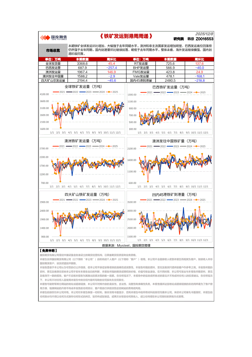 研报:国投期货-铁矿发运到港周周递-251208