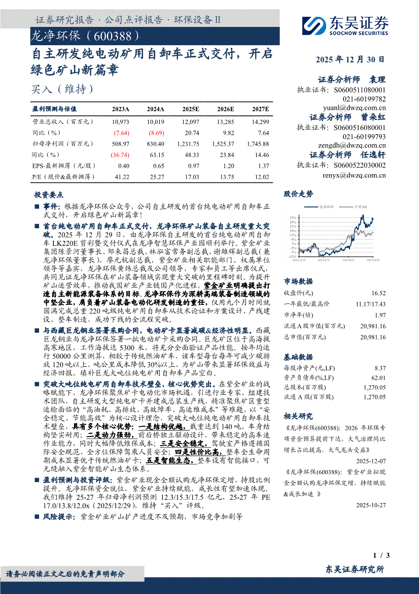龙净环保研报:东吴证券-龙净环保-600388-自主研发纯电动矿用自卸车正式交付,开启绿色矿山新篇章-251230