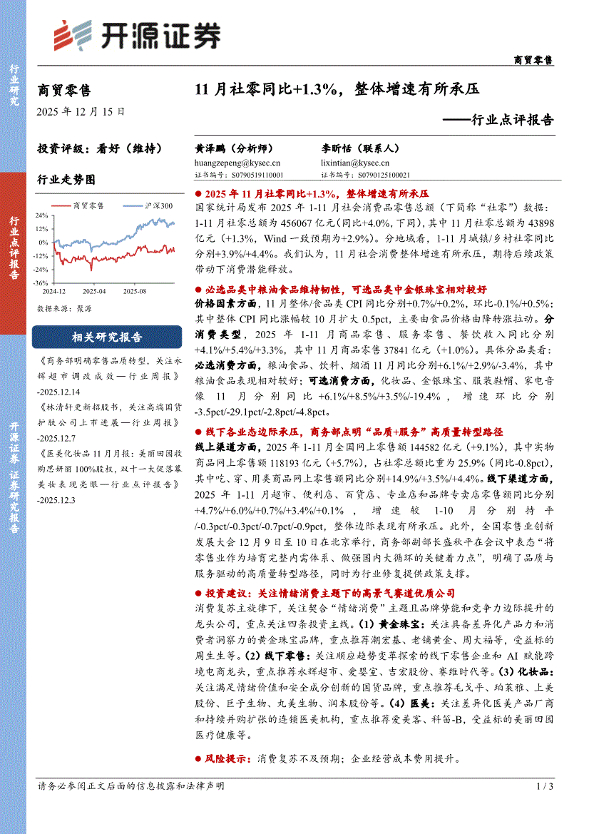 商贸零售行业研报:开源证券-商贸零售行业点评报告:11月社零同比+1.3%,整体增速有所承压-251215