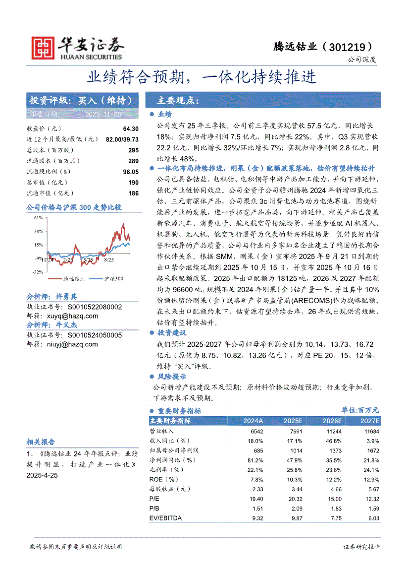 腾远钴业研报:华安证券-腾远钴业-301219-业绩符合预期,一体化持续推进-251106