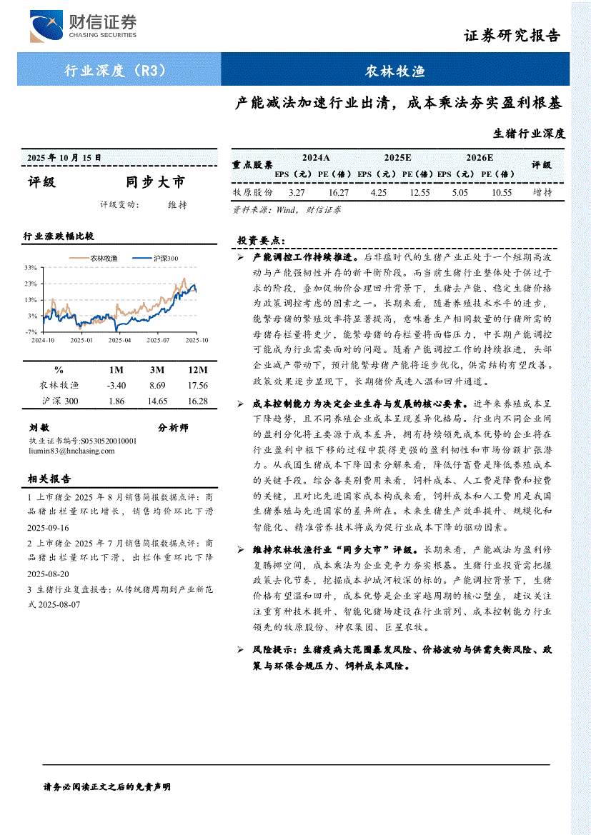 生猪行业研报:财信证券-生猪行业深度:产能减法加速行业出清,成本乘法夯实盈利根基-251015