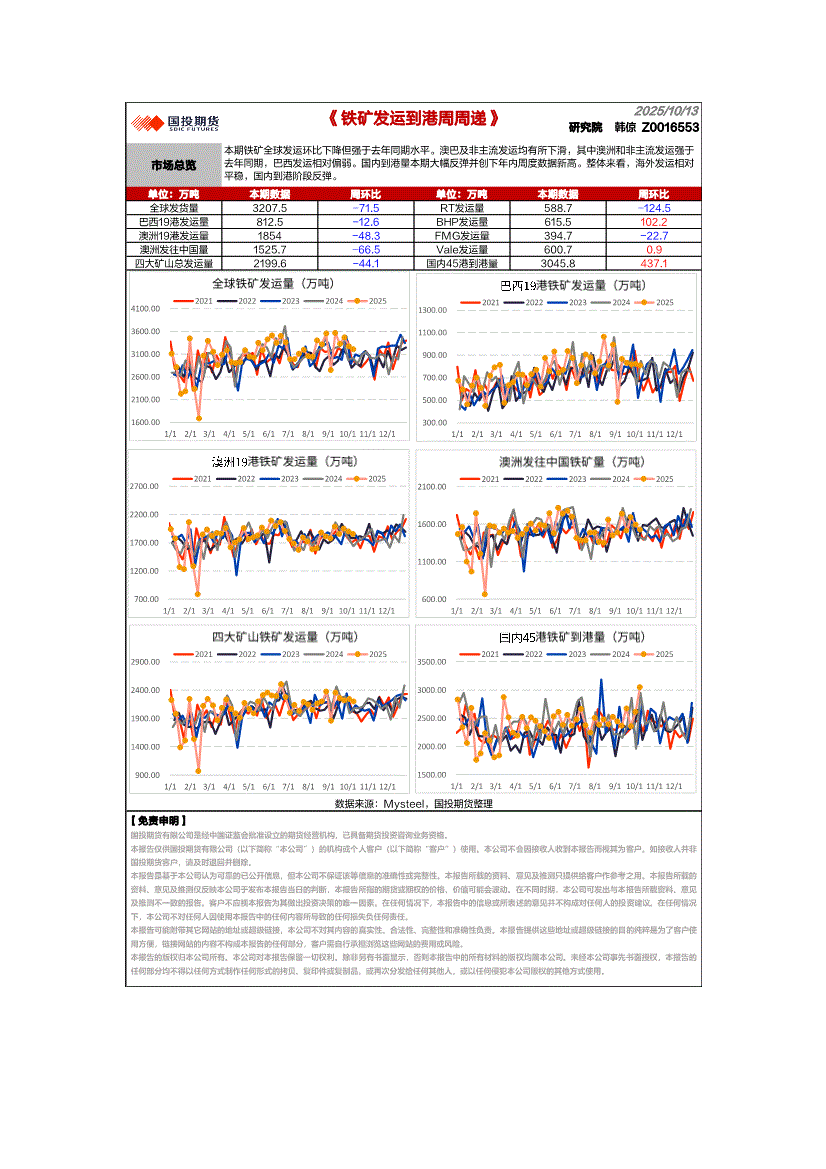 研报:国投期货-铁矿发运到港周周递-251013