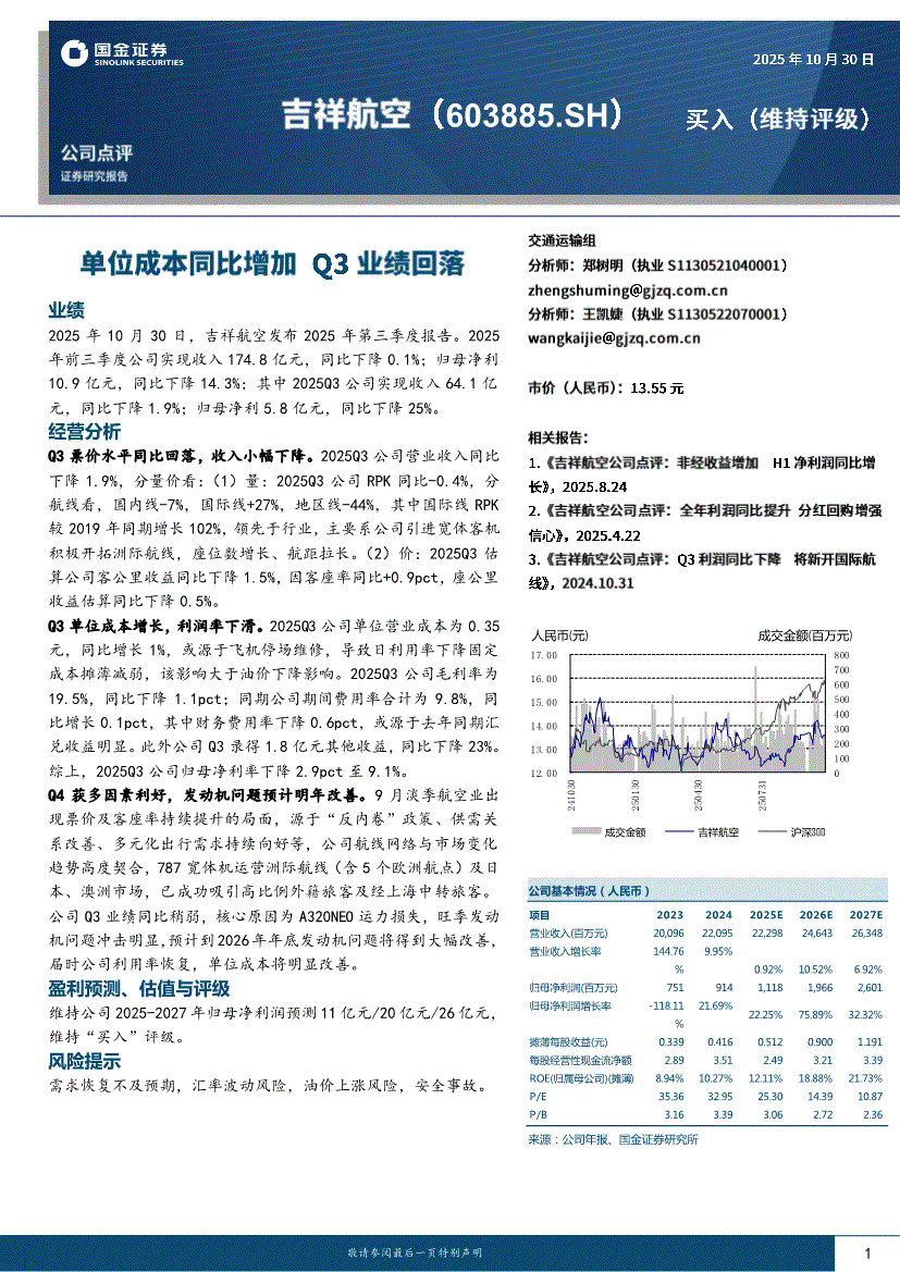 吉祥航空研报:国金证券-吉祥航空-603885-单位成本同比增加,Q3业绩回落-251030